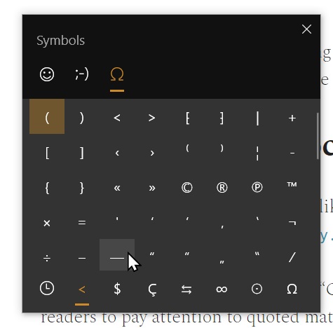 I like to type a quotation dash — using the Windows Emoji keyboard, by pressing Win + ., then going to the Symbols tab.